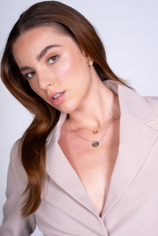 Small Yellow Gold Button Necklace With Emerald, Sapphire, Amethyst, and Aquamarine