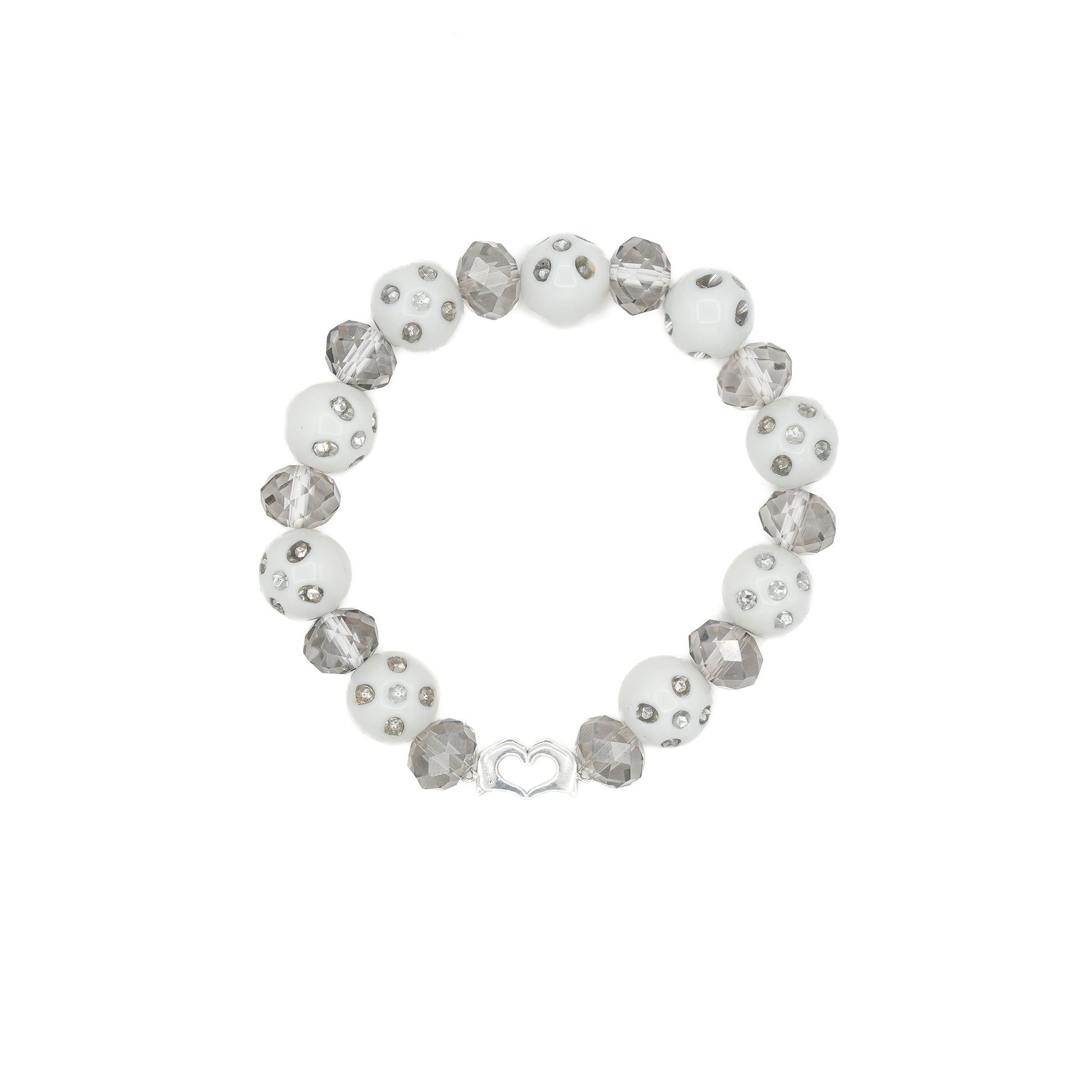 - Hand-strung with chunky white beads, dice-like accents, and faceted smoky glass